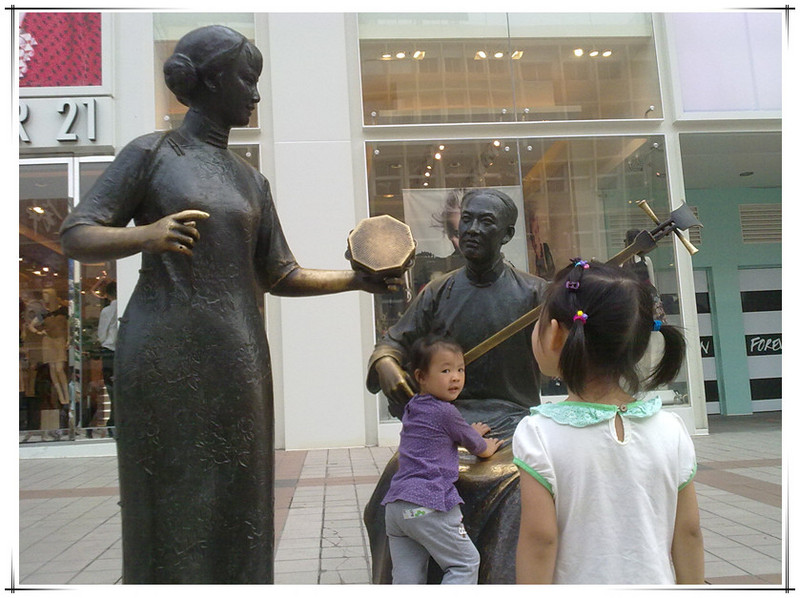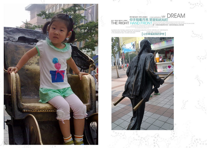 说是木偶剧,其实就是人穿上各种不同的衣服呀,袜子呀,手套呀,配上眼镜呀,帽子呀这些道具来表演,展现出来的时而是只鸵鸟、时而将后背或者膝盖变成一张脸...本来还以为是人表演的有故事情节的木偶剧呢!! 后面还表演了手影、舞台的灯光也总在变换。可惜不能拍照,就在开演前用手机瞎拍了几张,超级不清晰,凑合看吧!! ![]() 这是舞台 ![]() 四十分钟表演就结束了,超快呀!!大家都还意犹未尽呢!!看完出来,在门口和海报合个影吧! ![]() 步行十五分钟到王府井地铁站,沿途边走边看! 王府井大街上好多这种雕像,超级仿真,超级复古!!超喜欢!!照相的人都排着队,每个人就在这拉车上坐个几秒钟赶紧下来,底下排队的人跃跃欲上呢!! 卖唱的父女俩,超级传神。敬仪看的好专注,怎么都不肯回头让妈妈拍照!得,就拍个背影吧! 逛累了,在长凳上歇会儿吃点东西吧!! 路过一家卖北京特产的商场,门口有人装扮成皇上还是财神呀?正给人发红包呢,猜猜红宝里放的啥?哈哈,空的!!商家哪有还没赚到钱就赔钱的道理呀! 没带单反,也懒得用手机多拍,下次带上敬仪爸和单反,再来好好溜达溜达吧!! 本作品未经作者许可不得转载,转载请征求作者意见。擅自转载使用,将保留追究其法律责任的权利! |