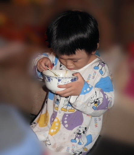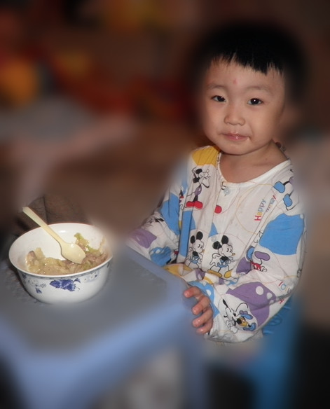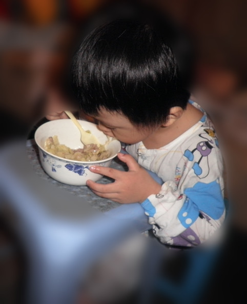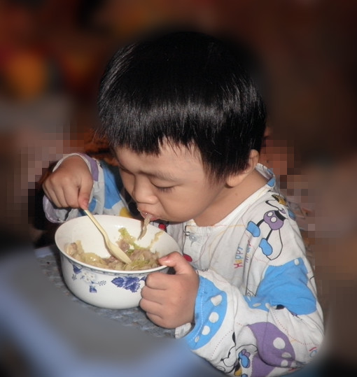 昨天下午带罐罐下去取了快递,就顺便在下面玩了一会,然后到车站去接他老爸下班,接到他老爸后就一起去菜市场买菜去了,老公司就问我买什么好呢,我看了看,干脆就买个大白菜吧,用大白菜切丝丝和肉丝炒,记得有段时间罐罐很喜欢吃的,都是老公看见罐罐喜欢吃大白菜还觉得很奇怪呢。 所以昨天就买了个大白菜来炒肉丝了,结果晚上刚端上桌时,叫罐罐吃饭,因为那时饭肯定很烫了,也没有急着叫他吃,等他自己先去玩会,等我们吃完了,饭也差不多要凉了,这才赶紧叫他来吃,谁知道他不好好吃饭,就想着玩去了,结果被他老爸拿根筷子在旁边威胁着他,他想叫我喂他,他好又东磨西磨的,我直接就回房间去了,来个不理睬他。结果他还是乖乖的自己吃完了满满了一大碗的饭。 话说这吃完饭才没一会的时间,我和老公坐在他的房间说话,突然就听见冰箱打开的声音,我悄悄到门口去一看,天啦,罐罐竟然又把那很大一盘的大白菜炒肉丝端出来,放在凳子上了,正在拿他的小手抓着吃呢。我一叫他,他一抬起来头来,天啦,受不了啦。。。。两只小手全部是油,嘴巴周围也全部是油,衣服上也有很多处,真是惨不忍睹呀。这是才吃了饭的人吗?怎么象个外面那些要饭的了,有没有这么夸张呀。这个到底是说你饿了,还是说你老爸做的菜好吃呢? 我一晚上都在想这个问题,难到是我们‘虐待’了他,没有给他饭吃还是怎样?直到今天中午,这个问题得到答案了。中午本来想煮米饭时,竟然发现连一颗米都没有了,这个该死的老公,晚上回来肯定会被我骂死,想饿我们娘俩呀。我赶紧去煮碗面条,想着罐罐平时也喜欢吃面条的,谁知道他竟然不吃,还是要吃那大白菜炒肉丝,可没有米饭呀,本来说马上下去买,可今天下了一天的暴雨了,没办法出门了,于是就让他这样光吃菜也吃得香香的。看来是他老爸炒的菜好吃 看看,这半碗都是菜 好专心的进食中 好不容易才抬起头来,休息一下 还是自己端着要稳当些,哈哈 本作品未经作者许可不得转载,转载请征求作者意见。擅自转载使用,将保留追究其法律责任的权利! 评分记录