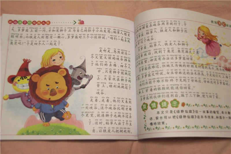 包装很仔细,服务也很好。 看看庐山真面目。销量惊人哦。 都是经典童话啊 附带配的光碟,可以放给宝宝听。 宝宝看到书非常感兴趣,拿着左看右看,亲子阅读,不仅可以增进和宝宝的感情,而且还能培养孩子的注意力,开始选择故事的时候,没有找拇指姑娘那样的长篇,而是挑了短小精悍的一篇,我选的是《绿野仙踪》,不过发现篇幅真的好简单,很多细节都没有讲清楚,对于很喜欢童话的我来说,倒是给我了自由发挥的空间。于是添油加醋,可以给宝宝多讲一点。 绿野仙踪,有很多表现形式,电影,动画片,长篇童话,广播剧,甚至还有真人版的舞台剧,这部充满奇幻冒险童话故事,有“美国的《西游记》”之称。 讲述的是善良的小姑娘多萝茜被一场龙卷风刮到了一个陌生而神奇的国度,并迷失了回家的路。在那里,她陆续结识了没有脑子的稻草人、没有心脏的铁皮人和十分胆小的狮子,他们为了实现各自的心愿,互相帮助,携手协作,历尽艰险,遇到许多稀奇古怪的事情。最终,他们凭借自己非凡的智能和顽强的毅力,都如愿以偿地完成自己的心愿。 在最终抵达翡翠城并战胜东方女巫的妹妹西方女巫后,奥兹给了稻草人发现自己有了会算数的头脑、铁皮人发现自己有了一个健康的心脏、狮子重新找回了勇气成了百兽之王,但他不能实现多萝茜的愿望,但多萝茜在银鞋的魔力帮助下,回到了堪萨斯农场、回到了叔叔、婶婶的身边。 这个童话包含了勇气,友情,亲情,机智,弘扬正义惩治邪恶,是个不错的童话,唯一的缺点是内容太过简单。不过,宝宝看到书上的图画,听着我润色的故事,还是表现的很积极的,打算继续进行下去,让亲子阅读达到更好的效果。 不过也想提提意见,那就是少部分童话不太适合将给宝宝,如果孩子听得懂,第一个故事《玫瑰花精》我就不太喜欢,还有《红舞鞋》这个故事,总有点可怕的语句在里面,强调正义固然重要,但是比较死亡,谋杀,刺死,砍掉这样的词汇,我还是更喜欢国内一些动画的积极方面的因素。但是总体上看,选择的都是经典童话故事,强调里面真正的内涵才算是达到了目的。 看到了吧,小家伙看的很认真哦。 本作品未经作者许可不得转载,转载请征求作者意见。擅自转载使用,将保留追究其法律责任的权利! 评分记录