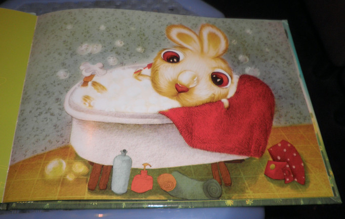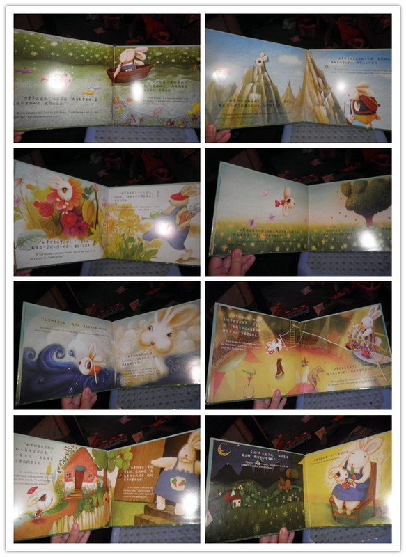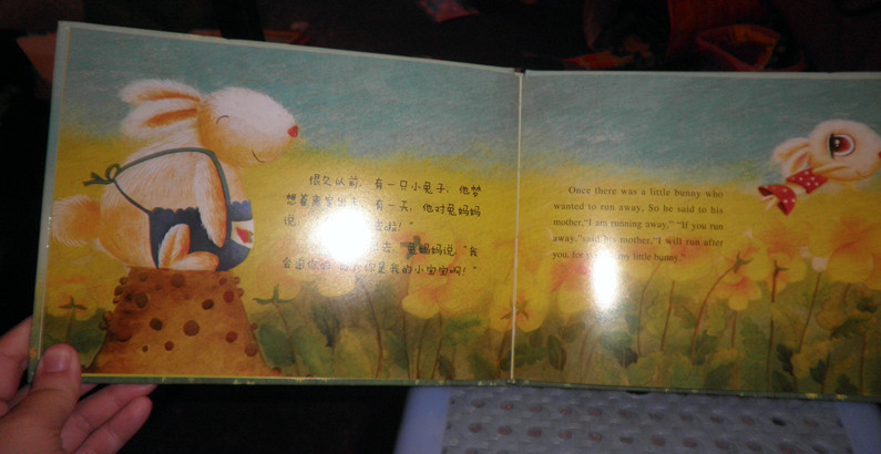 最近几天迷上了微博,有事没事都上去看看。这不,朋友又在叫我去转发了,这是一本温情的,充满诗意的绘本,相信无数孩子都和书中的小兔一样,想过离开家脱离妈妈的怀抱,到新鲜的大世界里去,等待妈妈的寻找,而无数妈妈都和兔妈妈一样总会紧紧追随的保护他,爱他,等待他倦鸟归巢。。。确实是一本值得推荐的亲子读物!而且这本书还是英汉对照彩绘版的,至于这个英语嘛,就由罐罐的姐姐来教他了,她可是专业人员,从事的就是幼儿英语培养,所以,这本书对于我们来说,太好了。 书的封面是硬壳的,很便于保管,颜色是绿色系的,很清新 一打开就看见一只大大的小兔子 里面的每一篇都是中英文一起的 这本书描述的是小兔子跟妈妈捉迷藏的故事,可是,不管想兔子变成什么,妈妈始终在它的面前等着它回家,当然最后的结局小兔子肯定还是乖乖的回家了。很不错的好绘本,值得推荐