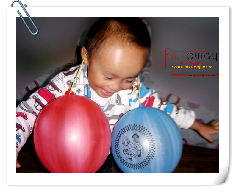 兴奋的谦小子开始玩起气球来了...... 尤其是当妈妈同时给谦谦带上两个气球耳环的时候 小家伙相当的开心啊