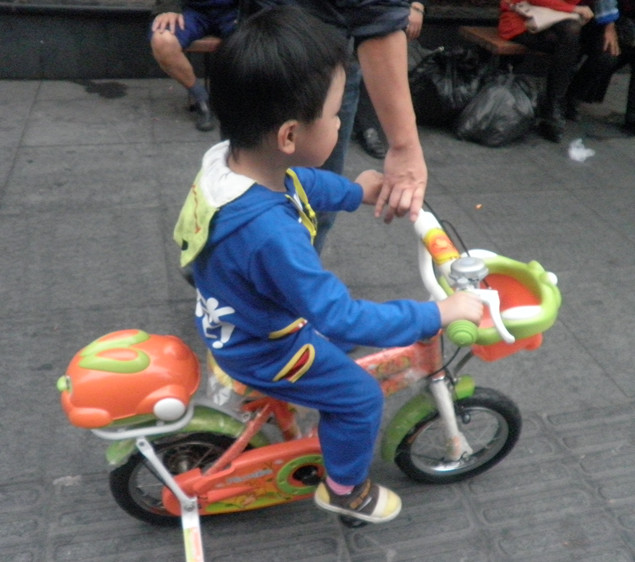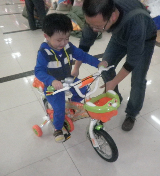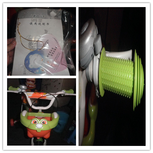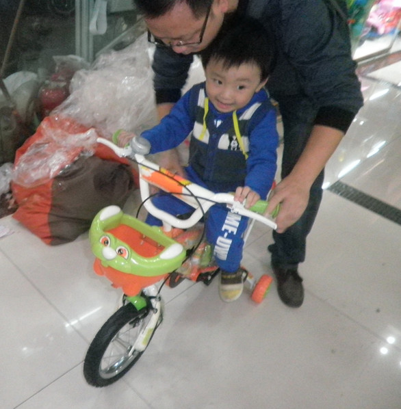原来一直都想给罐罐买自行车的,罐爸一直都反对,觉得不太实用,说是玩不了几年,要就没有下决心要买。结果我们这次国庆节时去綦江参加他表哥的婚礼,因为是提前上去,在那里住的公寓那种,没想到那里的老板家也有一个小姐姐,也就有个旧的自行车放到那里的,罐罐看见就非要去骑,还很会玩的,只是那时还不会骑,只有推着玩了。 结果我在打电话时就顺便给他姨妈说了,他姨妈一听,直接就说买了。于是在今天他姨妈本来是上早班,就约我们在她下班时去等她,然后就去批发市场那里看自行车了。一路上罐爸都还在耳朵边唠叨,说是自行车没有用,玩不了好久,听到都不舒服。本来现在小朋友都已经很孤单了,再加上这个可以有助于锻炼孩子的脚部力量和协调性。肯定要给他买一个了。 于是我和我妹妹在商场里面仔细看,罐爸就牵着罐罐在后面跟着就行了,我们差不多把那一层楼都看完了,终于在最后时看见合适的一辆自行车了 这是罐爸带罐罐在试车呢,看来效果不错,问了罐罐,他很喜欢,再问价格,原价是365,打折后是270,很便宜了,马上拿下了 说明书一张,手柄是防滑的,前面有个可爱的小篮子,可以放玩具的 座位也是很卡通的,连后面的小箱子也可以打开的,脚踏板和后轮,座位处还可以升高的,本来这款是4--6岁骑的,现在罐罐可以将就骑的 哈哈,骑着新自行车回家咯