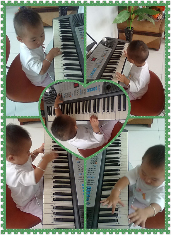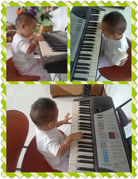 这前几天带盼盼去幼儿园,盼盼正好又看到钢琴了,又跑过去要弹钢琴,老师也说让盼盼弹吧,盼盼之前弹过一次了,这次特别熟练知道一按就响了,也是有了这一步按的,这样特别进步了,弹钢琴也像样了,老师也教盼盼手怎么放,盼盼也学,有点像弹钢琴的样子,那眼还不看钢琴,看上面的乐谱,手在钢琴上弹,真的很像会弹钢琴的人,不过盼盼还是太小,不能够把心完全放在弹钢琴上,弹了没一会就看到其它的东西就不弹的,跑到一边玩去了,脑子里就忘记钢琴了。