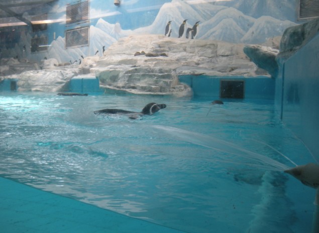 我印象中的企鹅,都是站在陆地,憨憨可爱的 可是看看它,虽然眼睛很大,但是显得很愣 后来注意到,每只企鹅的翅膀上都绑了个编号 原来饲养员也是靠编号来辨认它们的啊?呵呵~~