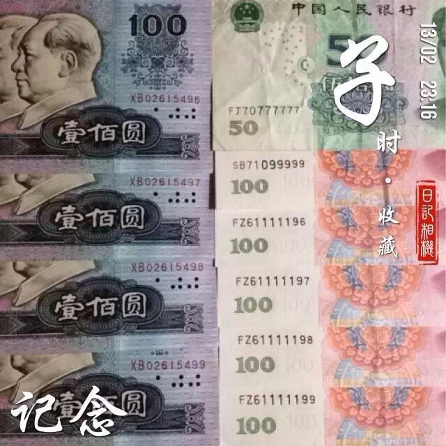 ![]() 说到人民币收藏,第一套和第二套印象中从没见过呢!而第三套是小时候经常看到的,也使用过的,细细回想大概有二十几年光景了吧!第四套就很普遍了,曾经有一段时间收藏过第四套人民币,但是没收齐时就给花掉了。第四套的百元经常有仿版的假钞,印象特别深刻!第五套人民币就是现在流通的货币,个人感觉目前还没有升值空间,所以没想过要收藏。 ![]() 收藏特别号码的人民币算不算呢?在收藏人民币的各种喜好里,我就属于对号码情有独钟的人。据了解,人民币上面的号码还有五大作用呢!第一:用来区分发行的时间,第二:用来计数;第三:用来辨残;第四:用来防伪;第五:用来保护人民币。长知识了,呵呵! ![]() 由于工作关系,我经常会接触到百元钞票,这一旮一旮的红票票,数的时候我都会留意一下上面的号码,看看有没有特别号呢?六六顺的?发发发的?最好还是一连串同一个数字的,遗憾的是到目前为止还没有一张特别顺眼号码的人民币入我的法眼,可以收藏起来的。 偶尔有遇一尾数是6688,或6888,或连号的,好像也没特别意义,又给花掉了。 所以对于人民币收藏,纯属业余爱好者,感兴趣,心动但没有具体行动。 本作品未经作者许可不得转载,转载请征求作者意见。擅自转载使用,将保留追究其法律责任的权利! 个性签名