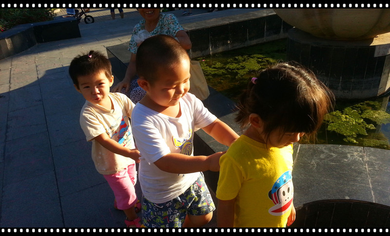 拍完照,三个小朋友玩火车头。睿睿当火车头,我让一一排到最后,最开始睿睿走的很快,这样一一根本跟不上,一一拽着衣服不知道松手,差点摔倒。后来我只好跟着一一,让华仔走的慢一点。三个小朋友慢慢走,玩了好一会,睿睿没长性又跑到别的地方玩了。 一一的性格绝对受父母影响了。我俩都是不爱说话,不爱出头的人,一般都是事件的参与者。一一也是,她喜欢和大一些的孩子玩,人家干啥她干啥,性格还好不怕生人,虽然也羡慕人家的孩子能说会道,不过想想这样也没什么不好,己所不欲勿施于人,顺其自然吧。