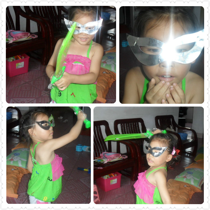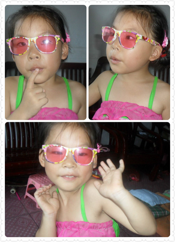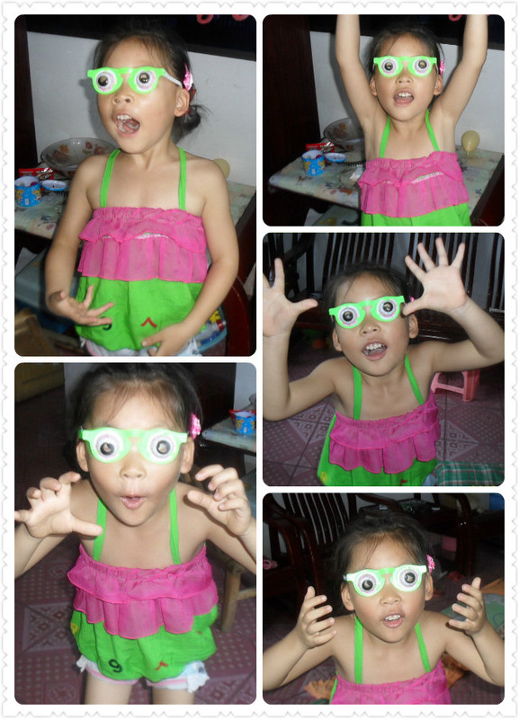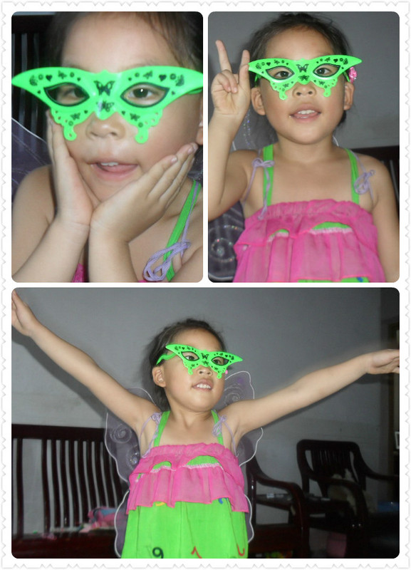 到店里选,她去选到了一幅眼镜,眼球布满血丝往外暴着,怪吓人的,可孩子似乎不理解这些,因为里面有两粒小小的糖呢!现在的商家真是花样多,两粒糖一幅眼镜,吸引孩子的眼球! 就是这一幅了,不吓人吧,我是怪兽,专吃胆小的!笑着的怪兽而已。 还有呢,这个银色的,也是买东西的时候送的,一个小小的玩具才5毛钱,里面还送一个,不知商家赚的是什么。带上这个,熠可英雄了,英雄得配宝剑,这个咱家也有,正好来几个POSE吧!看剑吧,比比谁厉害,周围的人让开点,我的剑可没长眼睛了,碰着了伤着了,可不是我的错了! 做完了英雄,我又变成了魔仙,巴啦啦变,变成蝴蝶仙子!这个是买的不是送的,再配上我的翅膀,真是绝搭了!我FLY,FLY,THE,BUTTERFLY,IN THE MEADOW,IS FLYING HIGH,IN THE GARDEN,IS FLYING LOW。 看过电影明星吗,那些一般时带着什么的啊!我也来SHOW大咖模样了,再来几个POSE,让你头晕了是不是?我是不是也很有范呢!嘘,不要喧哗,不就是大咖吗? 来,再来一张伟人的挥手之间,像吗?不准笑啊!