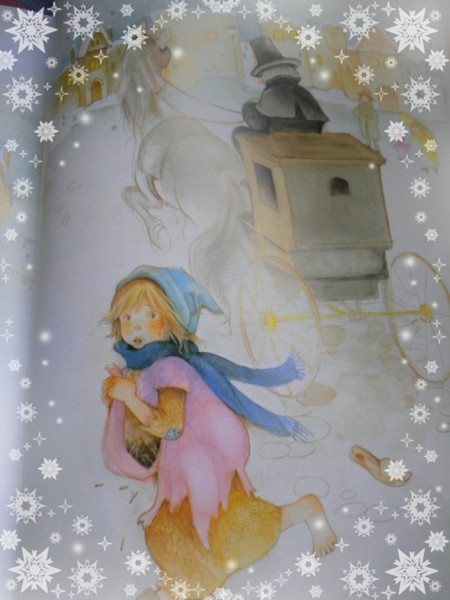 另外插图很唯美,屋子温暖的阳光和屋外严寒形成对比,路上行人包裹严实与卖火柴的小女孩单薄而破旧的衣着形成对比,以及前面小女孩卖火柴的可怜和后面从火柴微弱的亮光中看到的温暖而幸福的表情形成对比,这些强烈的对比让故事更加锦上添花,更加完美。