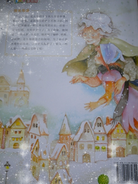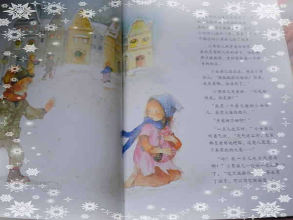 小时候关于这个故事印象最深的就是那句话“天冷极了,下着雪,又快黑了,这是一年的最后一天——大年夜”。而这本书也许是为了给孩子看着能够明白,没有这样开头。语言比较直白,细节描写很到位。比如我们还记得故事中那个抢走女孩拖鞋的男孩子说要把那只拖鞋当做自己孩子的摇篮,在这个故事中做了细致的描写,有了小女孩和男孩子之间好几组对话,从对话中更能体现故事的情节。还有小女孩的叫卖火柴的语言也很形象生动。这些是我们在以前的故事中没有看到过的。