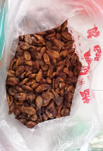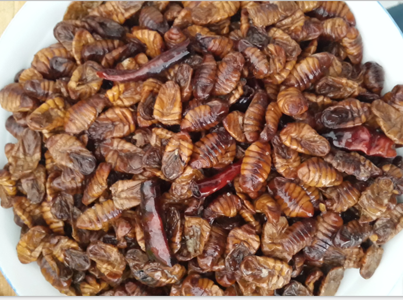 这蚕蛹回来就被我清洗了几遍啊,然后放上辣椒一起翻炒的,哇,这味道太香了,平日里半个馒头的我今儿愣是一口气一个馒头下肚啊!