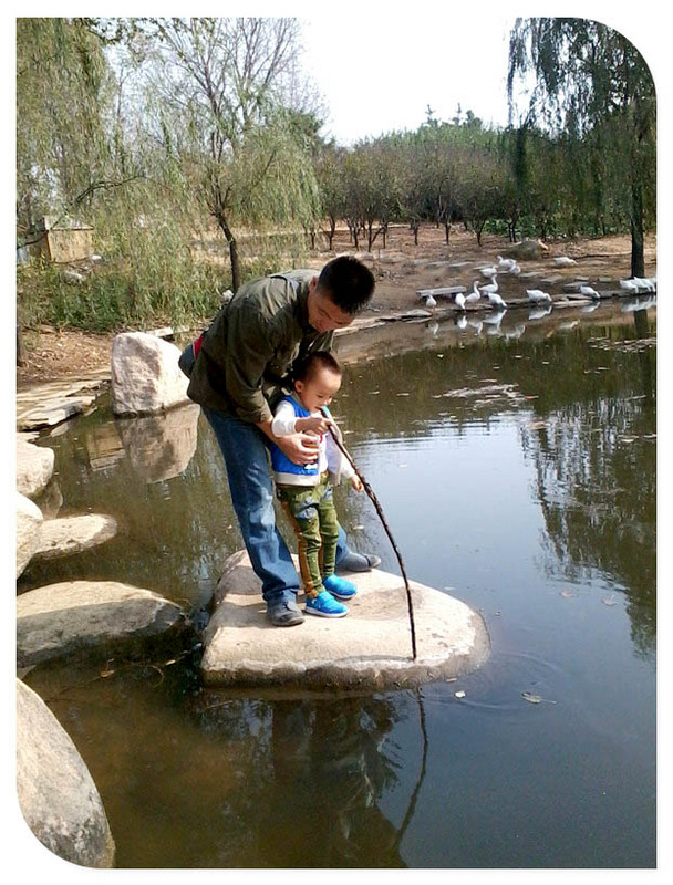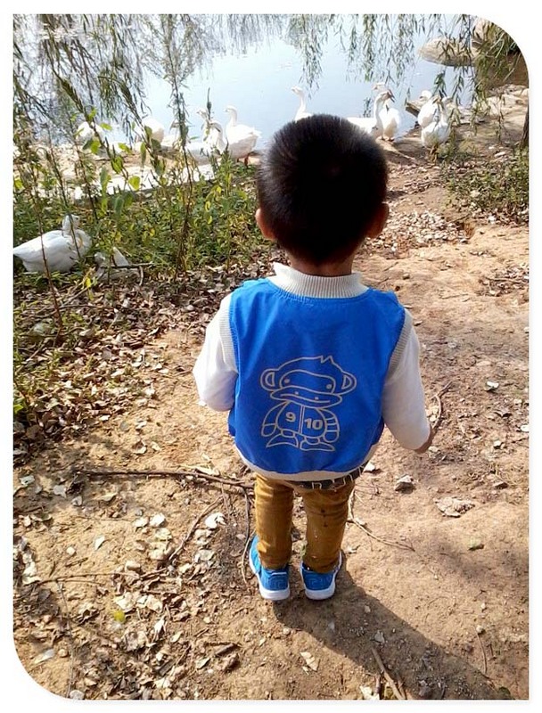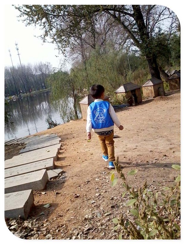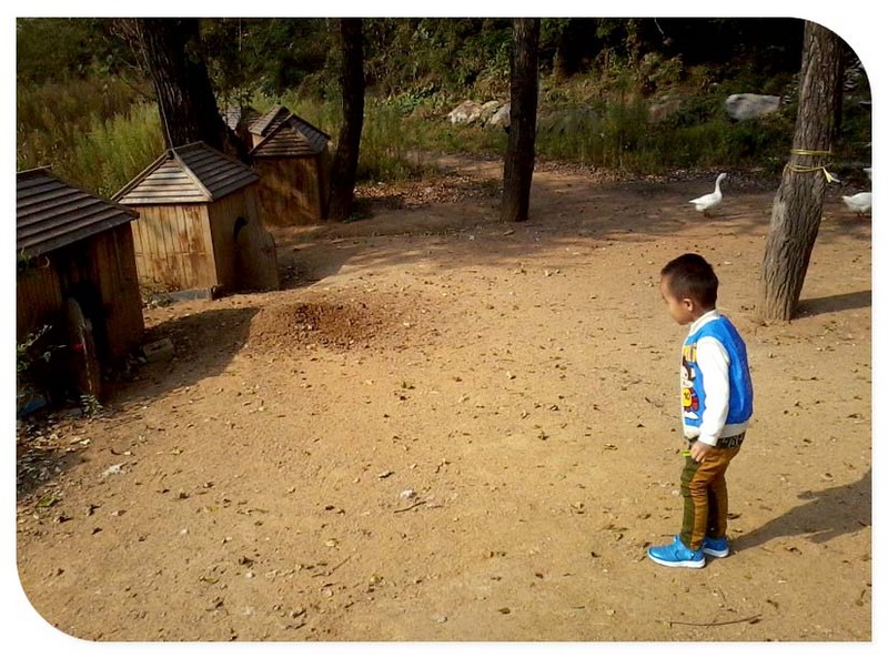对于城里长大的孩子来讲看到鹅真是一件挺新鲜的事情了,平日在小区里要是能看到几只鸡,谦谦都会很高兴的,追逐小鸡跑来跑去的,而且几乎小区里玩耍的孩子只要看到鸡就要追,弄的养鸡的婆婆都不敢把鸡给放出来了。现在可好,小家伙看到大鹅了,那个兴奋劲就甭提了,顺带给谦谦说了说幼儿园演出的不就是咏鹅吗,这个就是里面的鹅,谦谦当时还用手比划鹅头动的动作呢,这群大鹅溜溜达达的吃着什么,在附近还有几个三角形屋顶的小房子是给大鹅用的,其实是很有特点的鹅窝呢!谦谦走近鹅的房子还仔细的看了看,小家伙差点想进去被妈妈给抓住了,这群大额吃饱了就要到旁边的池塘里面喝水去了,昂首挺胸的往前走,谦谦紧紧跟随,妈妈告诉谦谦不要离得太近啊,大鹅的嘴拧人可疼了......