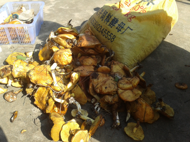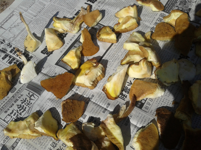 黄蘑菇采回来就要赶紧晾晒的,要不然一会就该生蛆了。 我们大家齐动手,把蘑菇上面的一层皮撕掉, 然后用手掰成小块,就晾晒在报纸上, 像这样毒的日头,一个下午就差不多了。