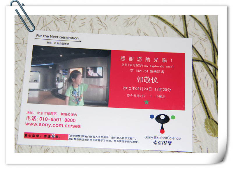 上周末9月23号,我们免费体验了一把朝阳公园里面的索尼探梦。每次去朝阳公园看到索尼探梦都特别纳闷,这到底是个什么地方啊?门票还要30一张呢!这次去了才知道,原来是一个科技馆,主要技术是光和声。比较适合大一点的孩子哈,比如小学生们!不过闺女去体验一把倒也非常不错呀!!长见识嘛!!