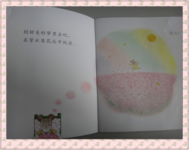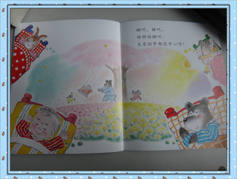书中讲的是一个小男孩,还有老鼠,黑熊、兔子晚上纷纷和月亮道“晚安”后,进入了甜美的梦想,梦中的景特别美,结果,他们的梦是同一个地方,他们都在那里开心的玩耍。故事简单,重复,但这正是适合1岁以上亲子共读的书,这个年龄段的孩子就喜欢这样的重复,让结果能让他们预知到,孩子们有一种成就感。
