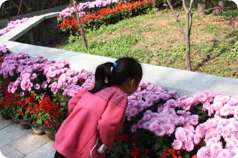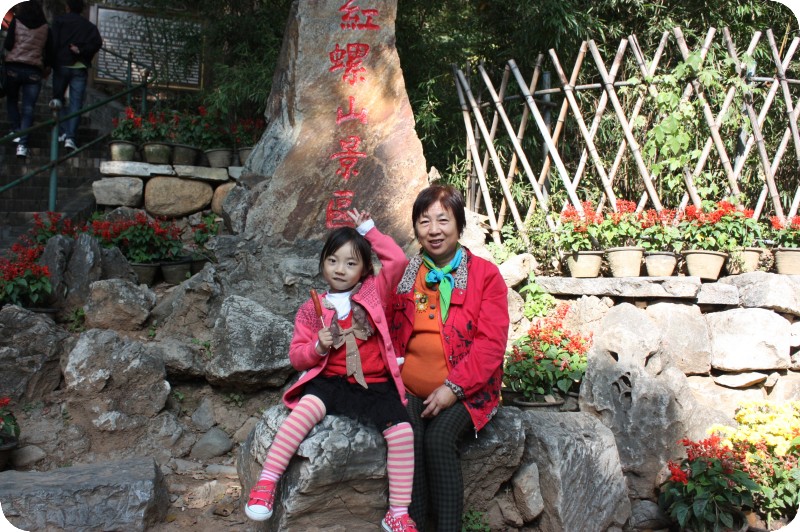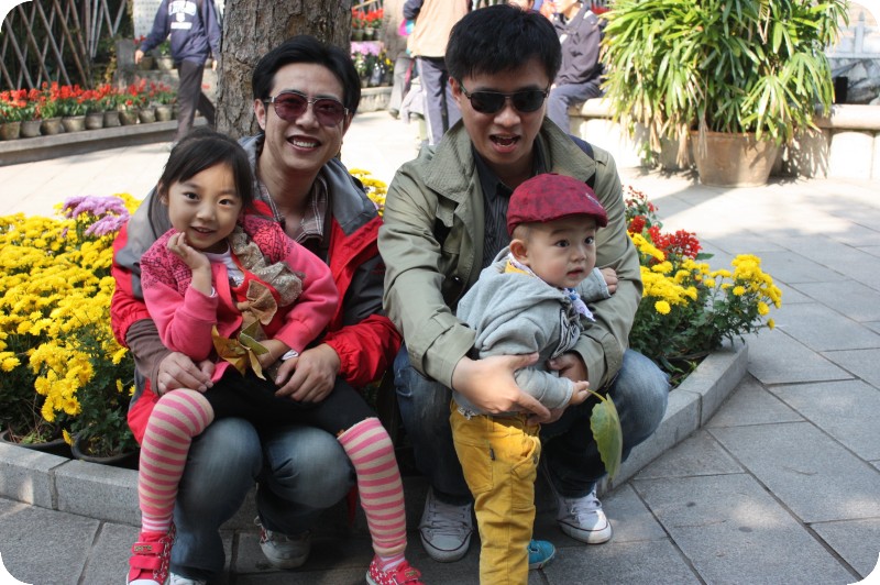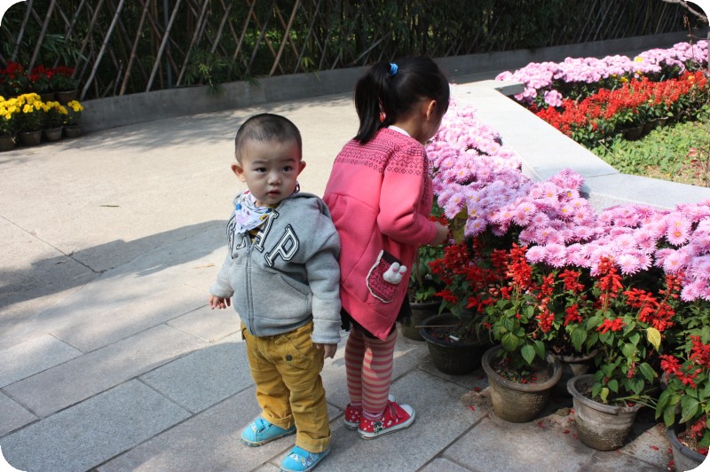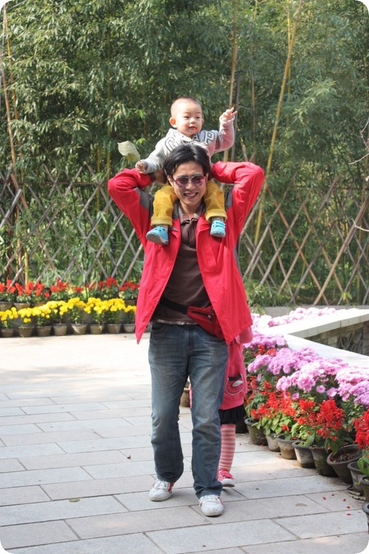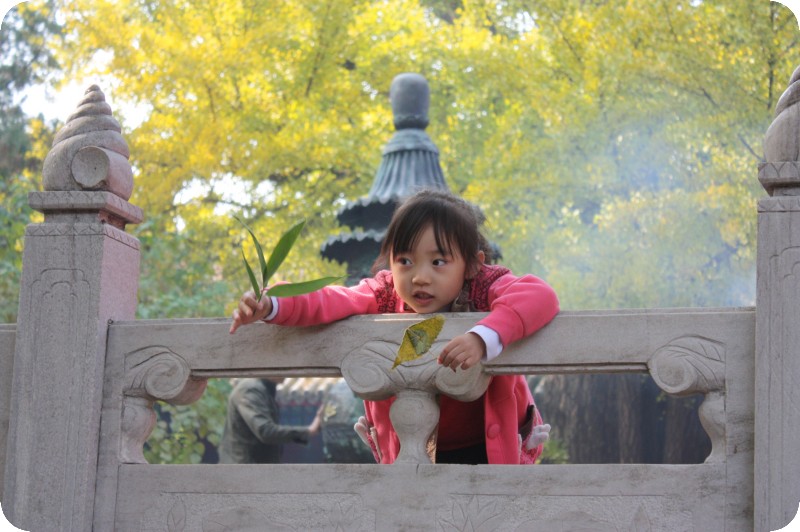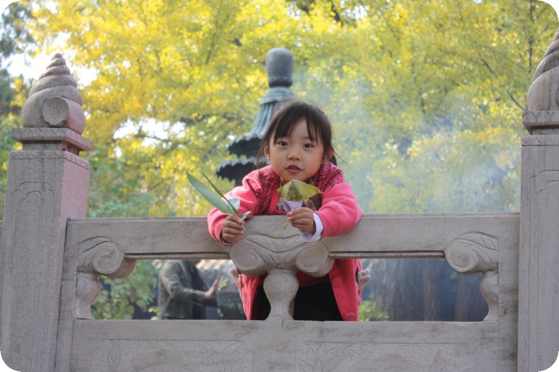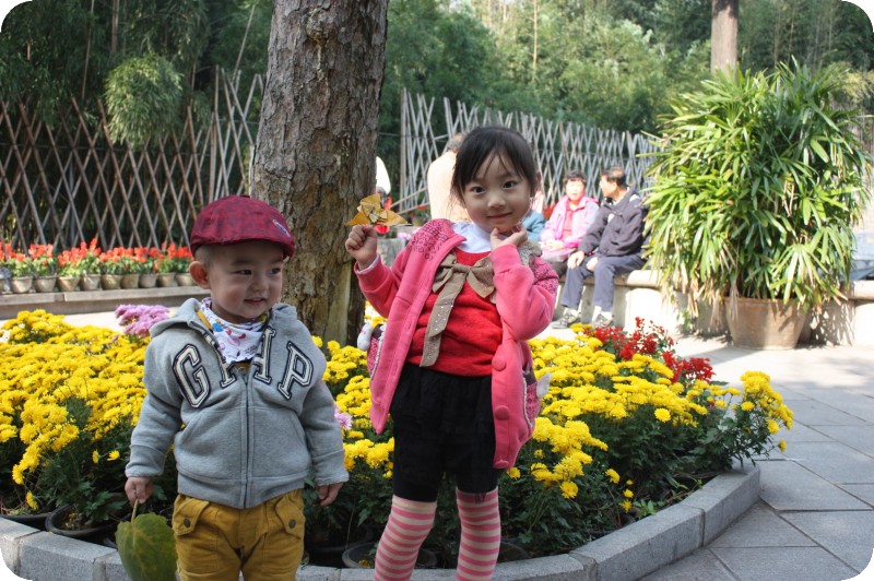 十月中旬,贝干爸说,周末一起带孩子去赏红叶吧,给孩子们拍点好看的照片。想想,也有半年没见小鱼儿啦,上次见面还是一岁生日,小家伙还不会说话不会走路,据说现在说话十分了得呢,必须要聚一聚了,孩子们也得联络联络感情,于是查看了天气预报,定下了10月20号这个日子,去喇叭沟赏红叶,也不知他从哪听说的这个地方,哈。 等到真正出发的那天早上,又说喇叭沟太远了,改去红螺寺吧。听说过这个地方,没去过,去吧。从我家到他家汇合,开车近一小时。汇合之后,去往红螺寺,大家都没去过,开着导航,握着手台,一路喂喂喂个不停,两个小家伙还没见面,先用手台开始聊天,小鱼儿干妈干爸、贝贝姐姐那叫的一个亲,真好玩,会说很多东西了,数数1-10、26个字母,不但会说还认识,那天下了车就开始认车牌,本事实在了得,颜色也都认识,是我见过的一岁半小孩中最聪明的,想当初贝贝两岁还不认识颜色呢。小家伙也不认生,让我抱,跟我玩,特和谐。 照片两家混着照,他家的相机高级,还有很多好照片没传过来,就先发发我们拍的。在门口贝干爸给拍了全家福,只能等啥时候拿到照片啦。 本以为去这么远的地方人会少,没想到人也挺多的,好在里面地方大,散开了倒也不觉得。环境很好,尤以各色菊花居多,我们带着孩子只是随便走走,走哪算哪,没有刻意要都逛了。爬山那一段,我、我妈还有佳佳带着两个孩子没上,逛了逛生肖园,其他人都爬到了最高处的观音寺,贝奶奶比较信神啊佛啊的,估计给观音烧香了,呵呵。