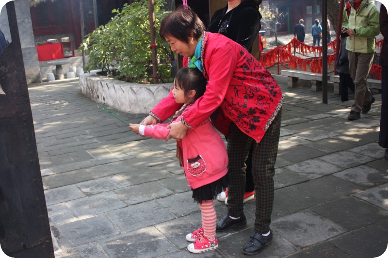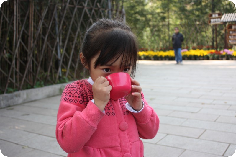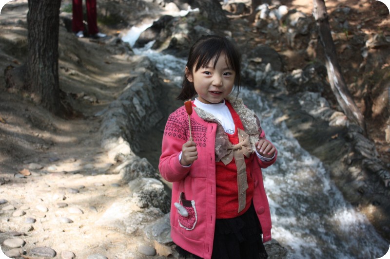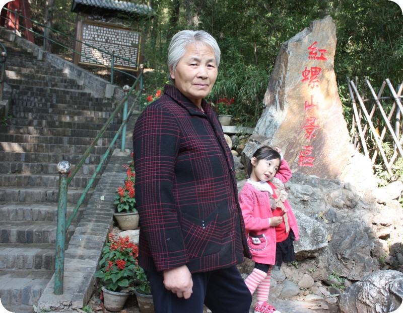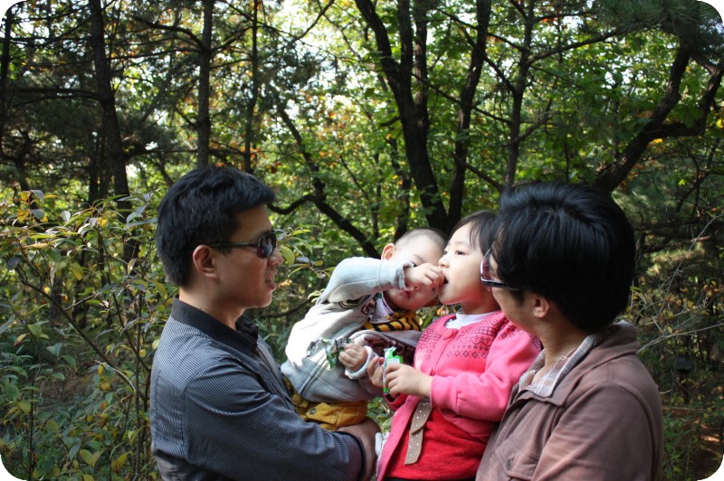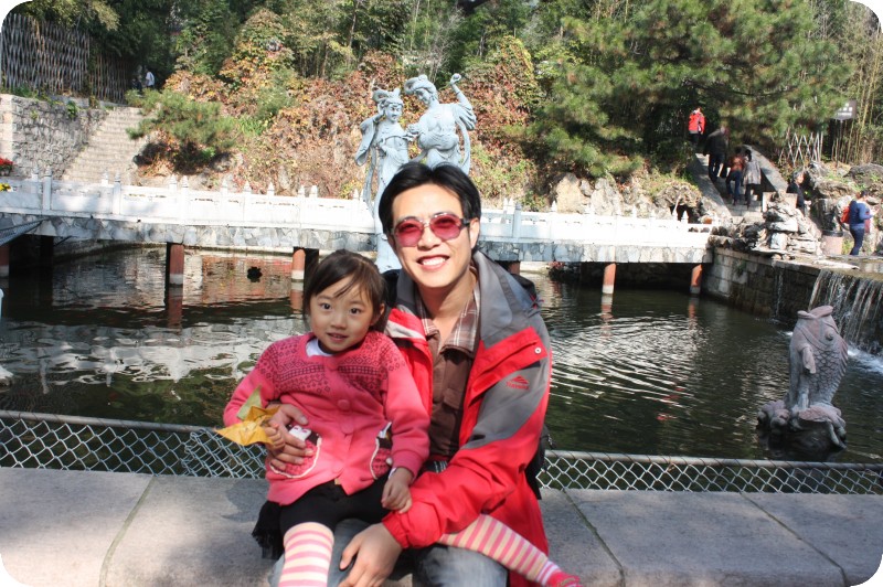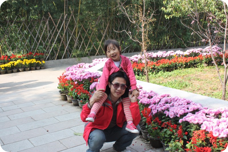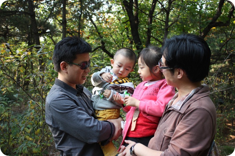 十月中旬,贝干爸说,周末一起带孩子去赏红叶吧,给孩子们拍点好看的照片。想想,也有半年没见小鱼儿啦,上次见面还是一岁生日,小家伙还不会说话不会走路,据说现在说话十分了得呢,必须要聚一聚了,孩子们也得联络联络感情,于是查看了天气预报,定下了10月20号这个日子,去喇叭沟赏红叶,也不知他从哪听说的这个地方,哈。 等到真正出发的那天早上,又说喇叭沟太远了,改去红螺寺吧。听说过这个地方,没去过,去吧。从我家到他家汇合,开车近一小时。汇合之后,去往红螺寺,大家都没去过,开着导航,握着手台,一路喂喂喂个不停,两个小家伙还没见面,先用手台开始聊天,小鱼儿干妈干爸、贝贝姐姐那叫的一个亲,真好玩,会说很多东西了,数数1-10、26个字母,不但会说还认识,那天下了车就开始认车牌,本事实在了得,颜色也都认识,是我见过的一岁半小孩中最聪明的,想当初贝贝两岁还不认识颜色呢。小家伙也不认生,让我抱,跟我玩,特和谐。 照片两家混着照,他家的相机高级,还有很多好照片没传过来,就先发发我们拍的。在门口贝干爸给拍了全家福,只能等啥时候拿到照片啦。 本以为去这么远的地方人会少,没想到人也挺多的,好在里面地方大,散开了倒也不觉得。环境很好,尤以各色菊花居多,我们带着孩子只是随便走走,走哪算哪,没有刻意要都逛了。爬山那一段,我、我妈还有佳佳带着两个孩子没上,逛了逛生肖园,其他人都爬到了最高处的观音寺,贝奶奶比较信神啊佛啊的,估计给观音烧香了,呵呵。