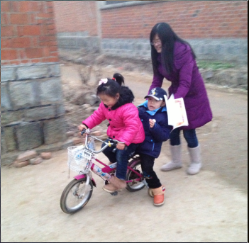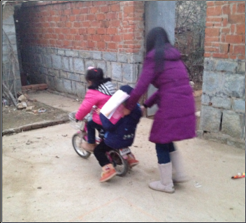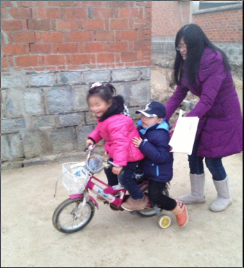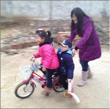我们一开始就告诉俩孩子称呼了:“青青是姑姑,畅畅是大侄儿”,但是青青觉得畅畅比她高一点,自然而然就喊畅畅叫“哥哥”,她对来接她的妈妈说:“哥哥划到我,我哭了” --------这不是青青告黑状,确实是有这么回事。俩人一人挥舞一根麦秸杆跳骑马舞,畅的麦秸秆尽朝青青脸边招呼,我拉都拉不开,终于麦秸尾巴稍扫到青青脸上了,青青捂着眼睛哭,我带青青去屋里拿橘子吃,告诉她“不给畅吃,惩罚他,只给你吃。”她才高兴起来。畅来找我,我暗示青青躲开畅吃,青青虽然人小,可是好明事理啊,她真的躲到橱子后面把橘子吃光了。 ![]() 我们又玩跳方格,拿小石头片扔到格子里,一人跳完一关之后把小石头交给另一人,轮流玩。青很守秩序,她如果把小石头片扔到格子外,那就算坏了,很乖的捡起石子交给畅。但是畅太调皮耍赖,他扔石子压到线也不算坏,扔到外面也要强硬着跳完这一关,一会儿又捡放完了的烟花筒子当小石子扔,跳完一关把烟花筒子扔给青青,而不是文明礼貌的递给青青。我都觉得这样玩青青太吃亏了,但是青青不生气不发怒,她恪守游戏规则,笑嘻嘻的玩得很开心。 老太太家有一辆小自行车,不知道是哪个孙子女小时候的,青青常在太太家玩,这小自行车就成她的了。现在畅畅来了,她就骑上去,让畅畅坐在后座上,准备带他。可是畅畅太沉了,她根本就带不动,这岂不是“3岁的老鼠抱4岁的猫”嘛。没事,没有条件创造条件也要上,大姑姑在后面推着不就得了,青青只需要掌把,象征性的蹬轮子,车子就飞速前进了,畅畅在后座上感受“飞一般的感觉”,俩人骑了一圈又一圈,乐得嘎嘎笑。 畅畅手里还拿本书呢,因为青青急着骑车带他,他连书都没来得及放下,就被拽来啦。 ![]() ![]() ![]() 到了拐弯的地方,因为速度太快,差点没撞到砖堆上去,大姑姑重新帮青青扶好车把,再次扬帆起航: ![]() ![]() ![]() 速度太快了,畅畅紧紧的抓牢青青。