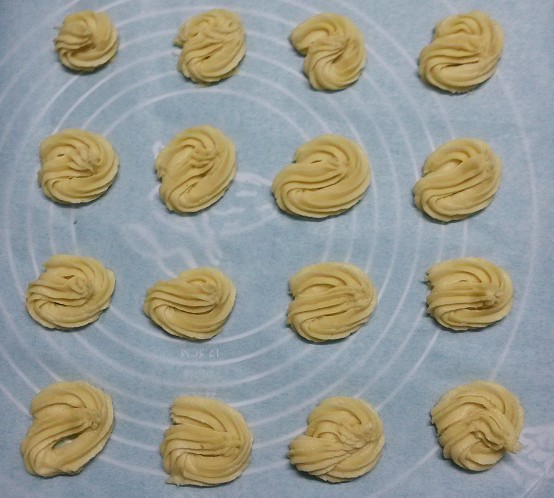最后装入裱花袋里,因为当时往裱花袋里塞料时把手弄脏了,忘记拍照了。我选的是8齿裱花模具,买的裱花袋是硅胶可以反复使用的那种,往裱花袋里装面糊和挤曲奇饼干的过程是整个过程中最麻烦的地方,可能我是第一次做,总觉得不顺手,怎么弄都感觉不好。