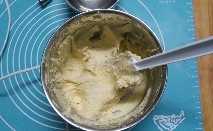 先把黄油打散,等到颜色变浅而且很顺滑,再加入糖粉搅拌均匀,继续加入淡奶油搅拌均匀,书上说用手动打蛋器就可以,可我想试试新买的打蛋器的效果,所以是用电动打蛋器打的,最后倒入低粉用刮刀搅拌均匀。