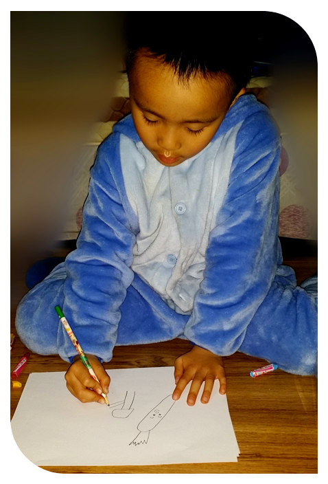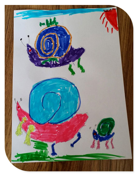 小家伙完成了自己的画后便喊妈妈过来看。谦满脸开心的给妈妈讲他画的蜗牛是长了腿的蜗牛,看起来好特别啊,原来蜗牛长脚也是一样的可爱呢!小家伙的画上一共画了三只蜗牛的,其中画面最上方那个不但长了脚还长了翅膀呢,谦说这是一只会飞的蜗牛,孩子的世界就是多彩啊,怎么想都是充满了童趣纯真。