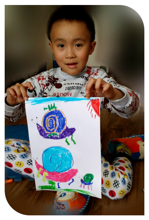 小家伙还特意拿起画来要让妈妈给拍一张, 真是难得啊,可见宝贝是很喜欢自己画的这幅蜗牛了