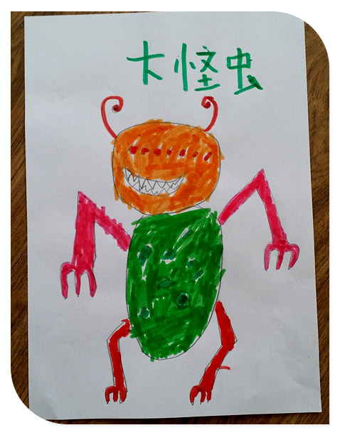 后来小家伙又画了一个大虫子,谦说这是大怪虫,看起来很奇怪的样子啊。个头大大的,基本上占据了一整张A4纸的大小了,而且这个虫子的眼睛长的也很多呢。小家伙还要自己写上画的名字,这个想法不错的,妈妈跟小家伙讲以后都可以将自己的画写上想写的名字,这样以后再看的时候就知道画画的内容是什么了。
