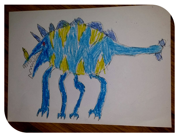 你能猜出来这幅画的内容是什么吗?小家伙说这是他画的“鱼龙”,有这个想法是受到了《我的第一次恐龙大发现儿童地图绘本》的影响了,书中有一种恐龙叫做“沧龙”,小家伙当时就很有兴趣的。在看谦的这个鱼龙吧,妈妈觉得小家伙给鱼龙身上的花纹涂色挺好的,这条鱼龙的嘴巴上面还有一个角呢,谦特意画的,还强调说这个角很厉害的,遇到危险的时候用来进攻敌人的。尾巴上还有两个圆形的尾锤呢,也是用来保护自己抵御敌人进攻的。