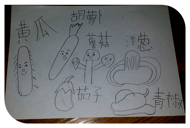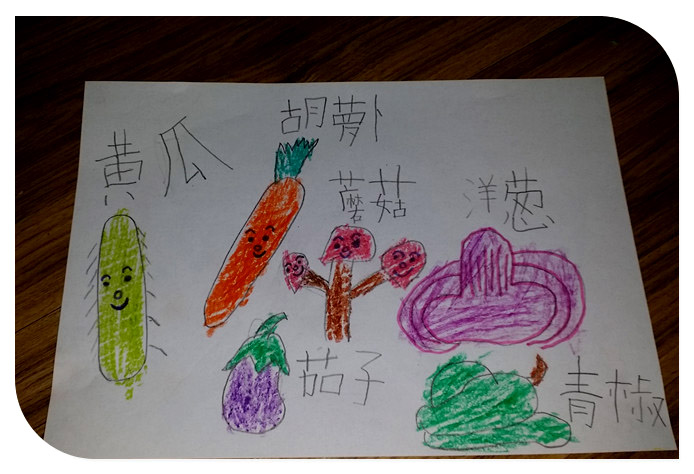 小家伙还真是画了不少的蔬菜呢,有黄瓜、胡萝卜、蘑菇、洋葱、茄子和青椒。这个蔬菜的特点抓的还不错啊。尤其是洋葱,如果是让妈妈画的话估计也不会想到这样画的,总的说来感觉还不错。谦还将蔬菜的名字写在了上面,这些字小家伙基本上都不会写的,妈妈写一遍,小家伙跟着学的,写完字后又把蔬菜涂上了喜欢的颜色。