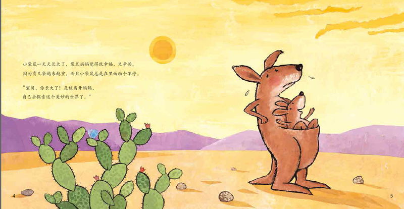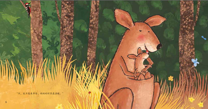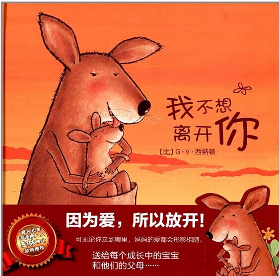 《我不想离开你》,讲述的是已经渐渐长大的袋鼠宝宝,却迟迟不愿意离开妈妈的育儿袋,让妈妈既觉得幸福又觉得辛苦,于是开始想办法让孩子离开自己的育儿袋,鼓励宝贝自己去探索这个世界。一路上用美丽的蝴蝶、嬉水的大象、跳舞的小鸟、荡秋千的小猴子、奔跑的长颈鹿.....等等,很多精彩的事情来吸引袋鼠宝宝离开育儿袋,试着独立自己走路。可是袋鼠宝宝依然固执地呆在育儿袋里,不肯离开妈妈的怀抱。这时,对面来了一只和他长得一样的袋鼠蹦蹦跳跳地跑来了,一下子吸引了袋鼠宝宝的眼球,终于他也愿意学着那只袋鼠一样开始自己行走了。最后,小袋鼠终于离开妈妈,奔向远方,享受着成长的快乐。