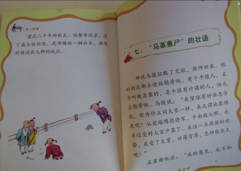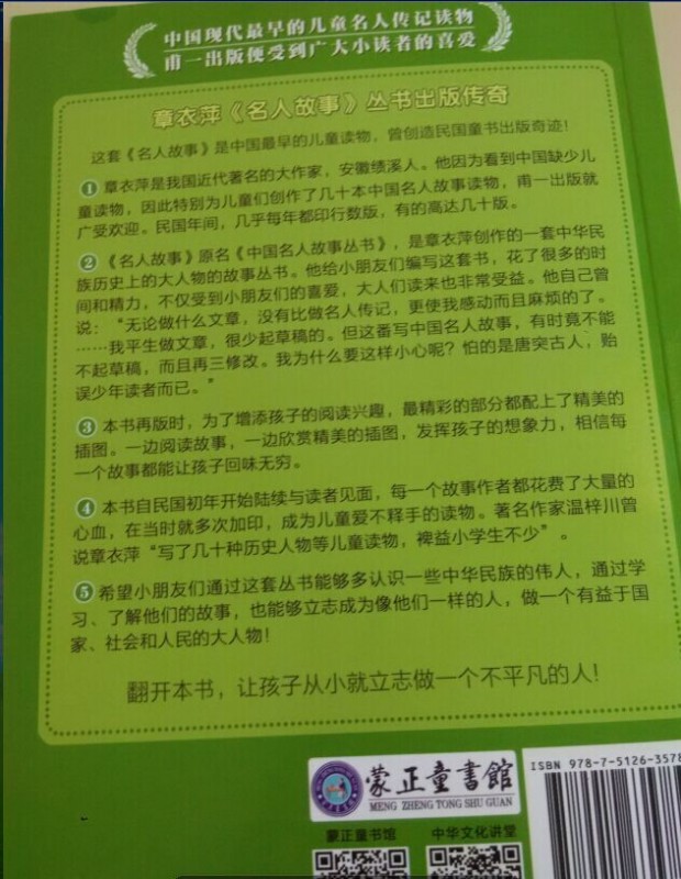 圣诞节帮助了圣诞老人,圣诞老人感激我,送我了两本很好的书,嘿嘿,来晒一下。 这套书的名字叫做《写给儿童的名人故事》。我收到的是17文天祥,和04马援这两册。 这两本是可是有故事的故事书,呵呵,有点绕口是不是。这是一个有历史的历史书。它是有章衣萍老爷爷为当时的孩子写的一本真实发生过的历史名人的故事。希望孩子们从小立志做一个不平凡的有大志向的人。章衣萍老爷爷做文章本不用打草稿,可是他却花了很多时间来给小朋友写这套书。比如,我手中的这本文天祥的故事书,是章衣萍老爷爷读了《文山先生全集》《文山先生纪念录》《宋史。文天祥》《文丞相传》《丞相传》《文天祥》这么多文献后,以三日四夜的精力几经修改才完成的。薄薄的一册书,却花费了很有学问的章老爷爷这么多精力。可见作者是在用心做一套给孩子看的书。 在民国几乎每年都会印刷好几版,这是第一套写给儿童的名人传记读物,成书以来累计销量已超过100万册了。 这套书有25册。讲述了一些我听说过的大名鼎鼎的人物,有些故事我还是不了解,给孩子讲的同时我也增长了见识。我希望我的孩子多认识一些我们中华民族的名人,了解他们的精神,学习他们身上的精神,在以后的人生路上,用名人的精神激励自己前进。 希望更多的孩子可以看到这套好书。 本作品未经作者许可不得转载,转载请征求作者意见。擅自转载使用,将保留追究其法律责任的权利! |