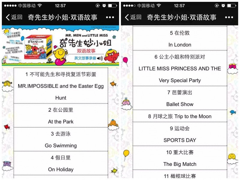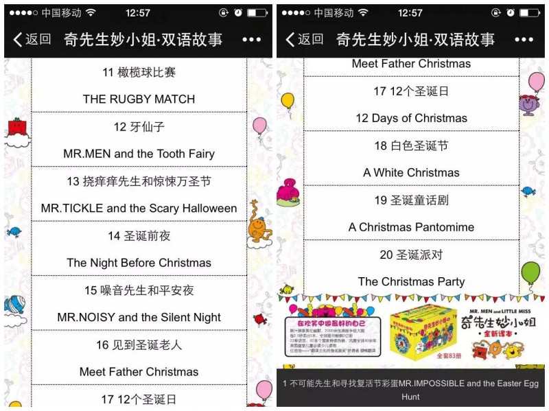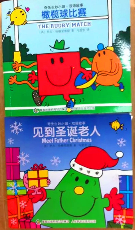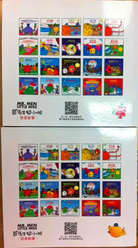 创作奇先生妙小姐的作者是英国的罗杰·哈格里夫斯,他创作的第一个奇先生是挠痒痒先生。据说他是因为自己的孩子无法理解挠痒痒引发了他的灵感,他在纸上画了一个几何图形,配上细细长长的手和脚,来形容挠痒痒这个词语,孩子看到这个形象以后一下就明白了挠痒痒的意思。后来他又创作出了很多不同个性的奇先生妙小姐,他们之间发生了很多幽默搞笑的故事,分享当天老师说奇先生妙小姐已经风靡欧美很多年,是每个人都会看的童书,不光是孩子,连成年人都非常的喜欢。 《奇先生妙小姐·双语故事》系列一共有20本,我收到是其中的两本——《橄榄球比赛》和《见到圣诞老人》。小小的跟成人巴掌大的小书,特别适合小宝宝翻阅,还方便随身携带,带宝宝出远门时带上一本奇先生妙小姐再明智不过了。因为是双语绘本,所以音频是必不可少的,封底有一个二维码,通过扫描这个二维码,就可以免费听到原汁原味的英式语音,简单又方便。