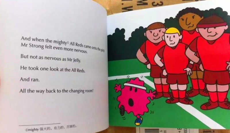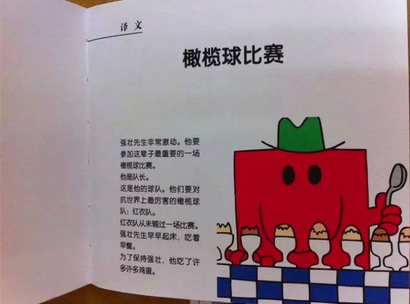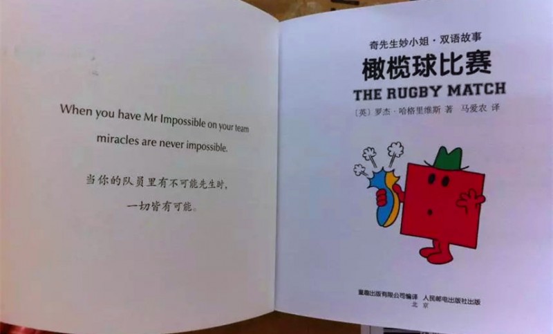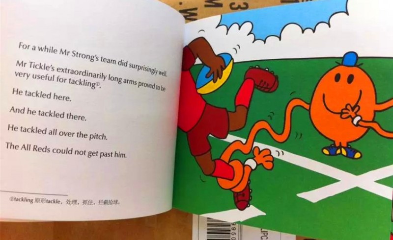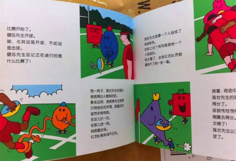 以《橄榄球比赛》这本为例,翻到扉页会有一行英文和一行中文,显示着“when you have Mr Impossible on your team,miracles are never impossible.当你的队员里有不可能先生时,一切皆有可能”。不可能先生?哈哈!真有意思,顿时引起我极大的兴趣继续往下翻。原来是奇先生们要参加橄榄球比赛啦,对手是从来没输过比赛的红衣队,还真让人即担心又期待呢。 强壮先生是奇先生队伍的队长,为了这个比赛做了很多准备,随着比赛的进行,奇先生们也纷纷表现出了各种个性。颤抖先生紧张地跑回了更衣室、健忘先生开球居然用高尔夫球杆、挠痒痒先生的长手臂拦住了红衣队、贪吃先生因为太重挡住了红衣队、匆忙先生飞奔出了球场、挑剔先生跑回更衣室洗澡、弹跳先生被踢出了场地、糊涂先生竟然把球传给了红衣队……奇先生们的状况一个接一个,比赛只剩最后一分钟了!当队长强壮先生意识到,要想赢得比赛除非出现奇迹时,不可能先生飞起来触地得分,太神奇了!奇先生们赢得了比赛!