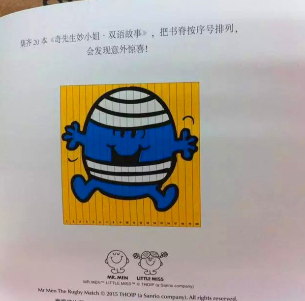 正如扉页所写的“当你的队员里有不可能先生时,一切皆有可能”,多么奇妙的小故事,多么奇妙的奇先生妙小姐!而双语绘本把中文和英文分开,先是独立的英文故事,最后才是中文译文,让孩子在阅读的过程中不受到中文的干扰,更容易对英文的学习和吸收。一本小书,中英文皆有,又不会互相影响和冲突,还有好听的音频和奇妙的小故事,如此幽默风趣的人物形象,孩子想不爱上都难啊!最后一页显示“集齐20本《《奇先生妙小姐·双语故事》,把书脊按序号排列,会发现意外惊喜!”,这个富有创意的小游戏也非常的新奇呢!再次感谢宝宝地带和童趣出版有限公司!