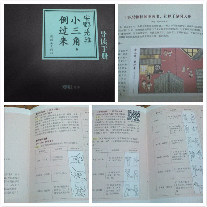 ![]() 《小三角,倒过来》是安野光雅以日本广为流传的歌谣为基础所创作的绘本。 歌谣有点像我们小时候玩的正反话游戏,重复的语言增加了语言的趣味性,从而锻炼了孩子的语言能力。让我有些惊喜的是它还附赠了一本导读手册和一个小手工。 手工游戏卡既可以锻炼孩子的动手能力,又练了嘴皮子。 导读手册能够帮我们理解书中内容,因为歌谣本身文字很少,图画占的篇幅大,且包含的信息量很大,如果没有文化基础,很多图画是难以看懂的。比如下面这张图,仅凭我的知识,只知道是鱼虾,蝌蚪青蛙,哪里知道什么爪鲵、平鱼、秋刀鱼。 ![]() 这还仅仅是自然常识,文化方面的内容就更多了,所以出版方很贴心地配了导读手册,宝宝很喜欢,经常指着导读手册问我,这是什么那是什么。导读手册后面还准备了一些适合各年龄段的亲子游戏,可以边念童谣边做游戏,增进亲子感情。即使是刚出生的小婴儿,妈妈也可以边念童谣,边和宝宝互动做游戏。所以这本书从0岁就可以开始看了。这几年看到的好书推荐越来越多,真后悔自己没有早一点意识到阅读的重要性。 书中的每一页画面都是可以倒过来看的。看书的时候不停的倒过来倒过去,宝宝也觉得很有趣。 ![]()