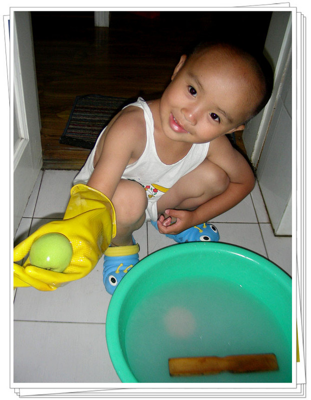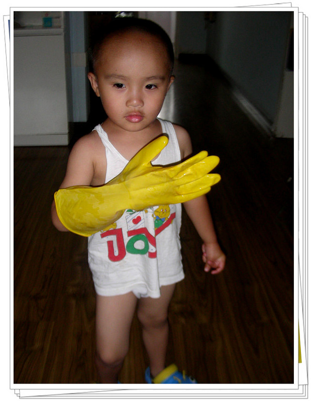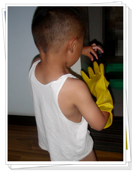 桃子拿回家,谦谦又有新想法,要给桃子刷刷毛。妈妈也懒得管了,愿意怎么玩就怎么玩吧。难得小家伙消停一会,妈妈坐在沙发上看了会电视....... 这个时候,谦谦过来了,让妈妈看他戴的手套,原来小家伙刷桃子的时候竟然想到了要带上手套,这样就不会过敏了,真是聪明的宝贝!!