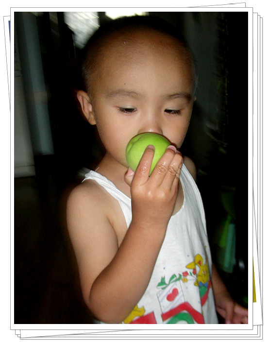 小区的院子里种了几颗桃树,上面的桃子也长不大,也没有人摘着吃,倒是成了这些孩子们好玩的东西了。谦谦也是喜欢摘桃子玩呢!但是每次妈妈都尽力阻止,因为谦谦这小家伙对桃子上面的桃毛过敏,去年的时候,就是因为手碰了桃毛然后摸了脸,脸就红了一片,痒痒的很难受。每次谦谦要摘桃子,妈妈一定提醒谦谦,桃毛过敏,小家伙也知道,单总是要摘,现在还想出了好办法,摘的时候管妈妈要张面巾纸,用面巾纸裹住桃子,这小家伙为了达到自己的目的还真是用心了。