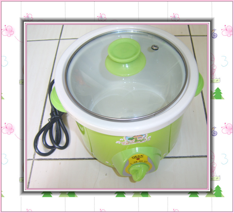 昨天我去五金店看了一下有没有专门卖内胆的,那个老板好娘说有,但她的宝宝在睡觉,她走不开,没办法去仓库拿。听说一个25元,因此昨天没买成。今天我就提了那个旧的外壳要去配内胆,我去了另外一间的五金店看一看,那间没有,在往回走的路上,看到官任小区有人摆着摊子在做以旧换新的活动,我就凑过去看了一下,刚好有那种1.5L的电炖锅,有三种不同牌子的,有一个比较便宜,只要贴29元就够了,但是那个内胆很薄,我就挑了这个款式的,把那个外壳给她,还贴了39元。呵呵,马上买了一个猪小肚,今天又可以炖个猪小肚给宝宝吃了。上图了