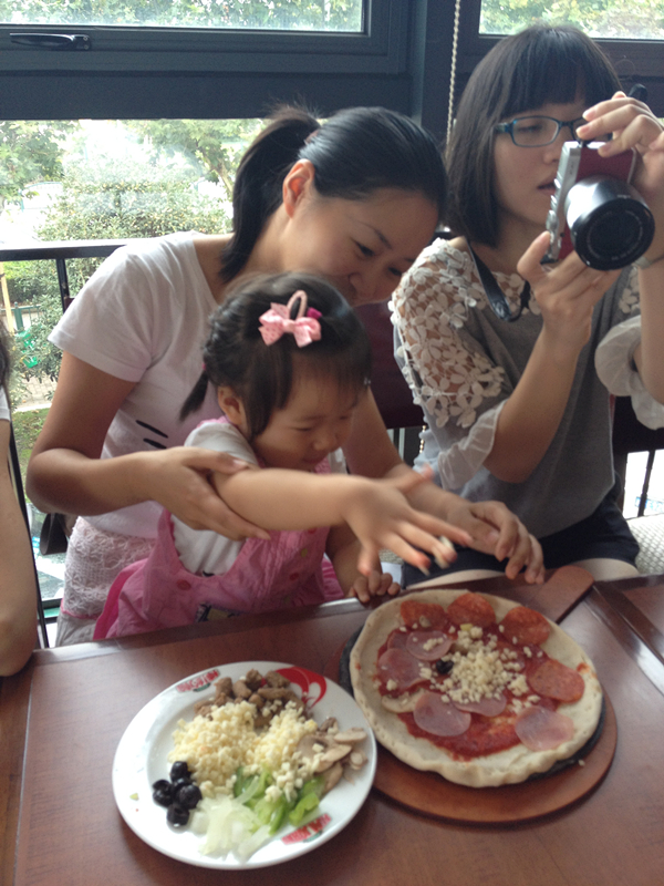 在等待匹萨烘烤的时候,小v老师组织我们一起拍手唱起了“pizza hut“的英文歌,等待的时间就变得轻松而短暂,等闻到后厨传来的阵阵香味,我们的匹萨就出炉啦!