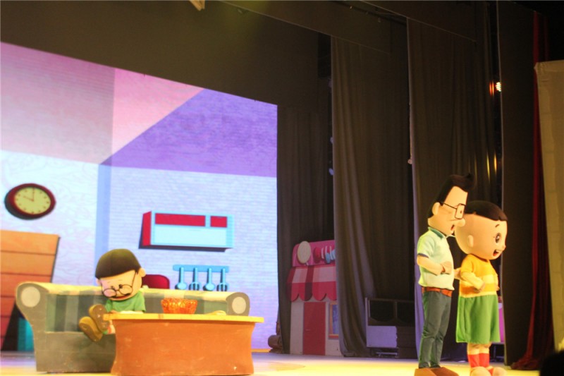 等我们进到剧院,舞台剧已经演了一半了。女儿看到月亮姐姐在灯光下讲话,非常担心的问我:妈妈,演完了吗?看了看时间,告诉闺女:没有。哎,真对不起闺女。妈妈保证,下次一定带你看一场完整的《大头儿子和小头爸爸》。