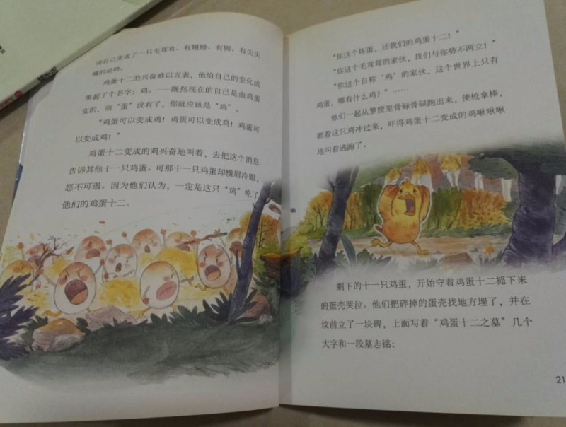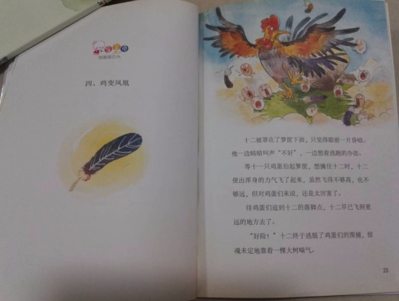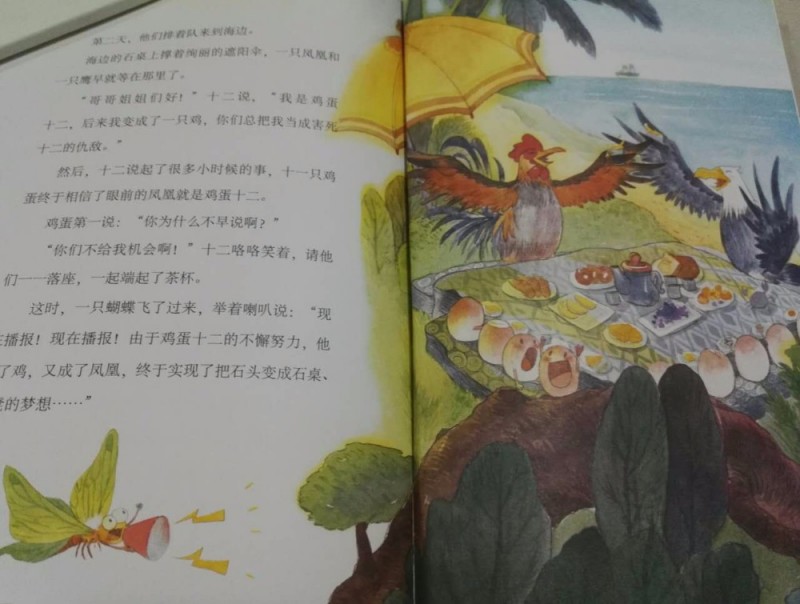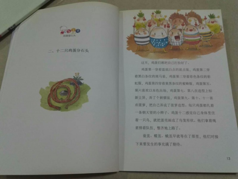 我们故事中有十二只鸡蛋,她们胸怀大志,她们有着崇高的理想,期望有一天可以把石头碰坏,碰碎,碰成碎末,这个理想多么的伟大啊。这些鸡蛋为了这个理想,不停实践着,但是一直没有成功,让自己伤痕累累。这一切都是告诉孩子们,很多时候必须为了心中的梦想去拼搏,是实践,这过程不可能是一帆风顺的,很多时候会经历痛苦和失败,这个时候必须审视自己,到底应该怎么做,有时候坚持梦想也是需要勇气和决心的。鸡蛋们没有气馁,它们想了无数办法,可惜对手太强大了。鸡蛋十二看着坚硬的石头在想这么美丽的石头可以用来打磨变成桌子和椅子那该多好啊,但是其他的鸡蛋都嘲笑它。鸡蛋因为这个梦想突然间感觉身体迸发出很多力量,它从鸡蛋里破壳而出,变成了一只鸡。鸡蛋十二感觉到当一只鸡的乐趣,很快乐,很自由。因为其它鸡蛋不再认识它,而且认为是它杀害了鸡蛋十二,从而捕捉它,它在逃跑中又感觉到飞翔的乐趣,又有了展翅飞翔的愿望。它不停的练习,练习,再练习,终于真的飞上了蓝天,变成了一只凤凰。它一只没有忘记自己最初的愿望,将石头变成桌子和椅子,它在朋友们的帮助下,利用切割机终于将石头变成了桌子和椅子,她请鸡蛋们石头桌子上聚会,它终于成功了,梦想变成了现实。